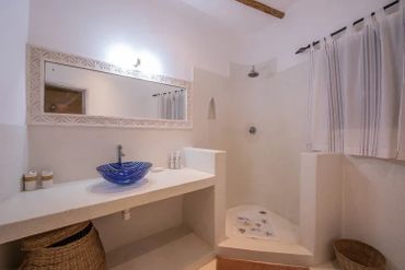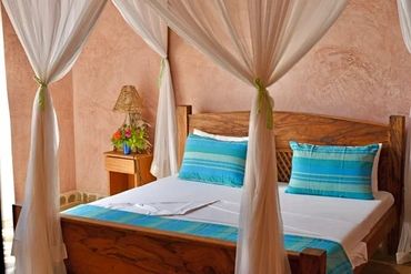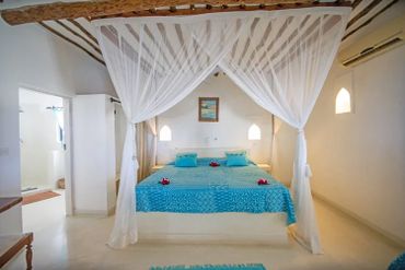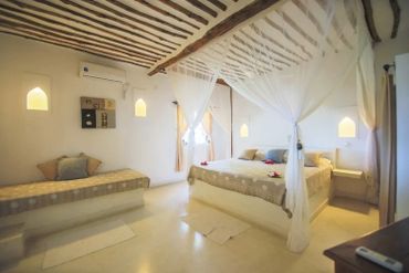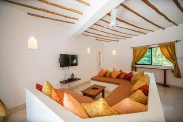 Flanking the pool area connected to the main house by arched corridors, are two large bedroom suites, each with fitted mosquito nets, air-conditioning, ensuite bathrooms and a private shaded roof terrace above. Each of these roof terraces has a couple of lamu beds that can be made up as single beds with mosquito nets and a stand fan. A third double room with mosquito net, air-conditioning and ensuite bathroom is within the main part of the house on the ground floor along with a TV room with satellite TV.