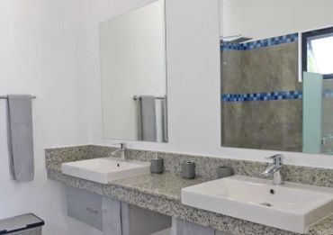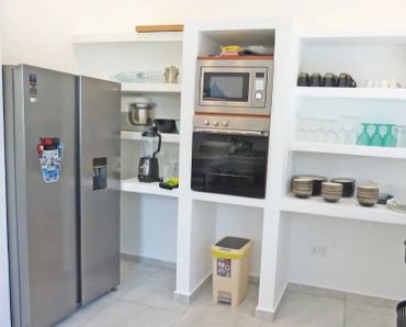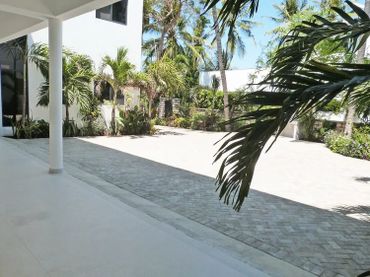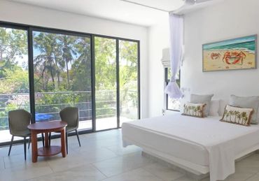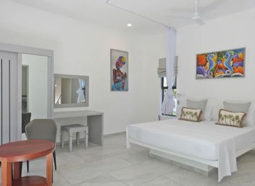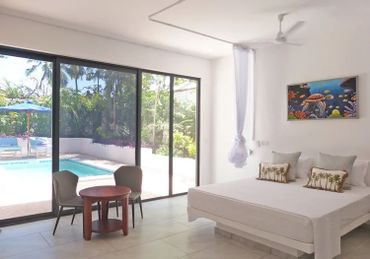 A grand staircase leads up from the pool area to a spacious covered terrace with outside dining table for up to 10 guests on one side and a cosy seating area on the other, both with views over the garden to the Ocean Off the terrace is a large open plan living room that leads to the inside dining table and refurbished kitchen beyond On the ground floor, are two large double rooms with ensuite showers with overhead fan, fitted mosquito nets and air-conditioning. Both have an additional fitted single bed/sofa