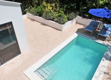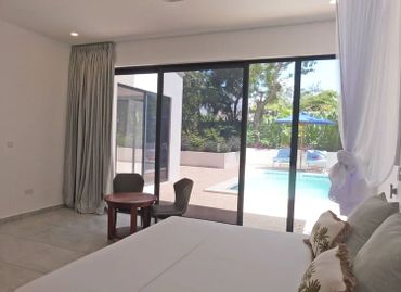 There is one large air-conditioned ensuite bedroom located on the ground floor that not only offers spacious accommodations but also features large windows that look out onto the inviting pool area, effortlessly leading guests to the refreshing waters just a few steps away.