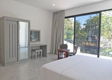 The property has two large bedrooms downstairs, each with a double bed, fitted mosquito net, overhead fans, air-conditioning and ensuite bathroom. They both have an additional fitted single bed