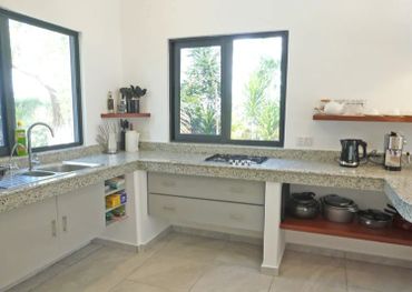 Reef is one of two beautifully constructed, modern three-bedroom cottages featuring a refreshing private pool. This charming property is ideally situated just a short walk away from the nearest public beach access, which leads you directly to a stunning section of Turtle Bay Beach, renowned for its soft sands and the enchanting surroundings of the Watamu Marine Park. For larger groups or families seeking accommodation, Reef’s sister cottage, Coral, can be reserved simultaneously to comfortably accommodate a maximum of 12 guests, including children. As you enter the charming cottage, it opens out into a spacious living area characterized by its high ceilings, creating an airy atmosphere. The thoughtfully arranged dining table and large, comfortable sofas invite you to relax while offering beautiful views of the pool and lush garden area outside. At the opposite end of this inviting space, you will find an open-concept kitchen that is well equipped and designed for convenience, perfect for preparing meals and entertaining guests.